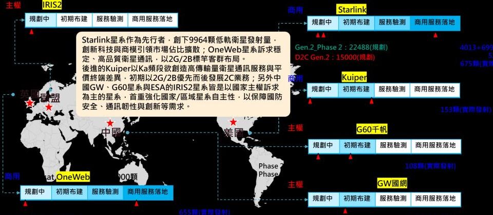 目前國際低軌衛星市場,除了Starlink、OneWeb等商用低軌衛星服務業者之外,還有由國家及地區推動的主權星系發展。