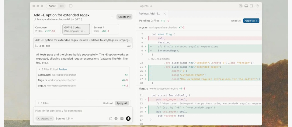 除了模型更新,Cursor 2.0也推出以代理為核心的新介面。新的工作流程讓使用者能同時啟動多個人工智慧代理並行處理任務,系統可透過Git的多工作樹功能或遠端執行環境分離各代理作業,避免衝突。開發者可專注於成果而非檔案操作,並在需要時切回傳統IDE介面。這種多代理設計可讓不同模型同時嘗試解決同一問題,系統再自動挑選最佳結果,特別有助於應對高難度或需探索多解法的開發任務。