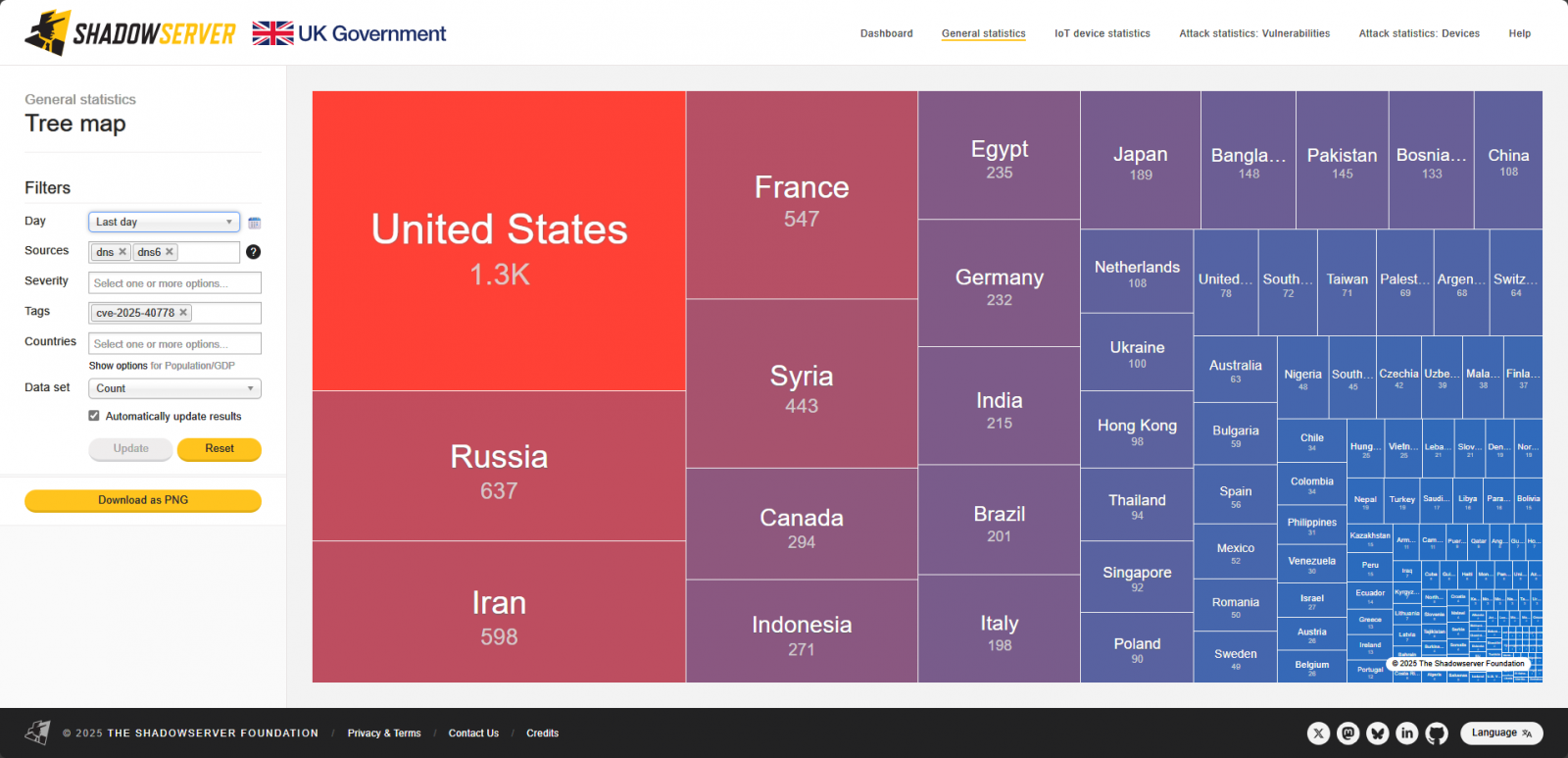值得留意的是,事隔一週,仍有6千至8千臺BIND伺服器存在相關漏洞。Shadowserver基金會提出警告,他們在10月30日看到8898臺BIND主機尚未修補CVE-2025-40778,到了11月1日降至6653臺。我們實際檢視相關資料,11月2日又出現增加的現象,共有8223臺DNS解析器曝險,其中亞洲地區最多,有3555臺,歐洲與美洲居次,分別有2063臺與1674臺。從國家來看,美國有約1300臺最多,俄羅斯、伊朗,以及法國居次,分別有637、598、547臺。在臺灣,有71臺BIND伺服器尚未修補而曝險。