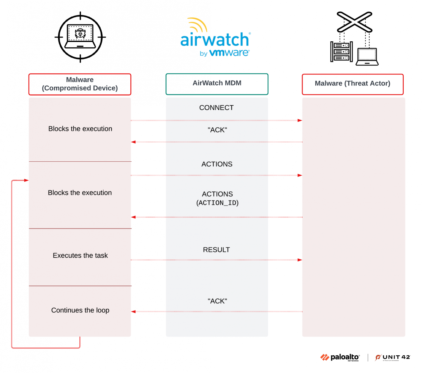 此惡意程式的獨特之處,在於駭客濫用VMware的裝置管理平臺Workspace ONE Unified Endpoint Management(原名AirWatch)特定API,來建立C2通道,主要遭到濫用的功能,包含管理自定型態裝置的屬性,以及檔案上傳機制。