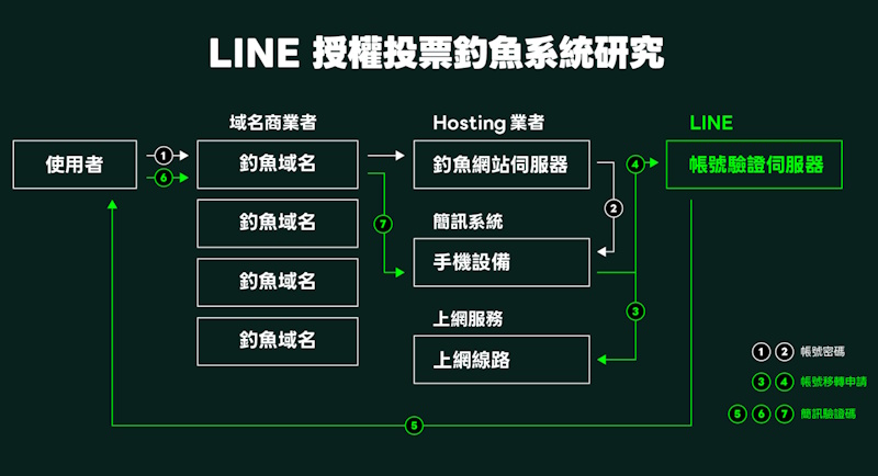 LINE繪製出了一張授權投票釣魚系統研究架構圖,呈現出使用者遭誘騙點擊了投票釣魚網站後,到詐騙集團引誘取得使用者轉移帳號的過程。