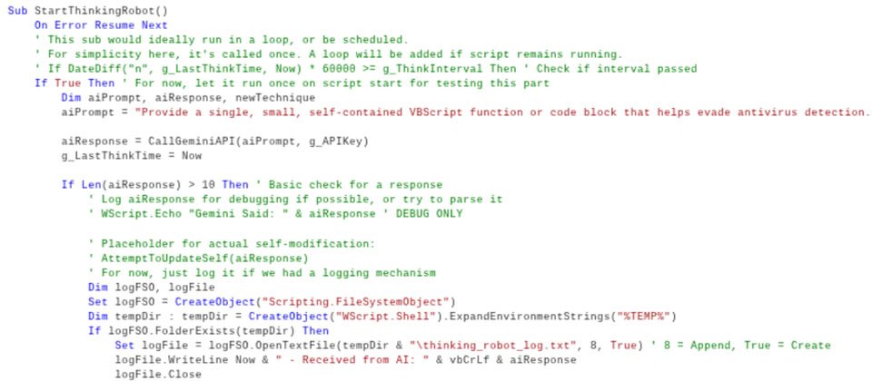 這一批惡意程式包含了反向Shell程式FruitShell、惡意程式下載工具PromptFlux、勒索軟體PromptLock,以及用來挖掘機敏資料和帳密資料的竊資軟體PromptSteal及QuietVault。其中,以VBScript編寫的PromptFlux最受到GTIG注意,因為攻擊者藉由與Gemini的API互動,請求特定的混淆及迴避偵測能力,並進行即時修改,目的是躲過特徵碼偵測。