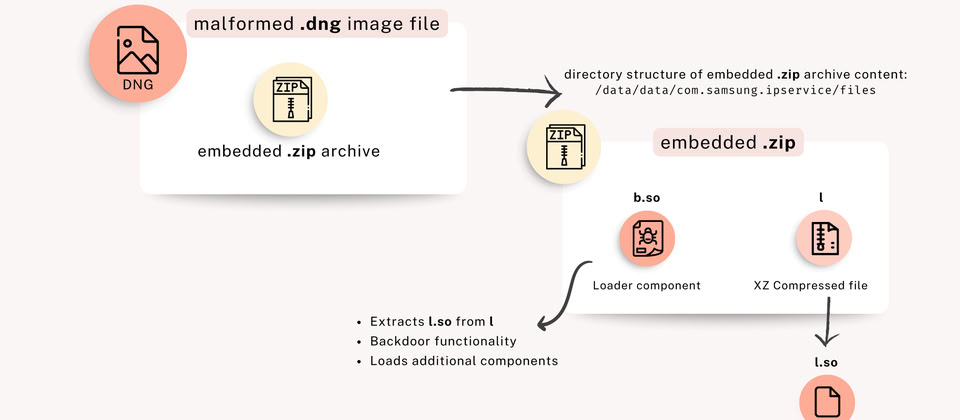 對於LandFall攻擊行動的發現,源自於Palo Alto Networks對於前述iOS與WhatsApp漏洞利用鏈的調查,於是他們在調查iOS惡意程式調查的過程,找到了專門針對三星行動裝置的間諜軟體,其共通點在於利用了CVE-2025-21042,攻擊者使用的DNG圖檔,在結尾嵌入ZIP壓縮檔,一旦三星手機的圖片程式庫libimagecodec.quram.so存在漏洞,手機就會從ZIP檔解開程式庫並執行間諜軟體。