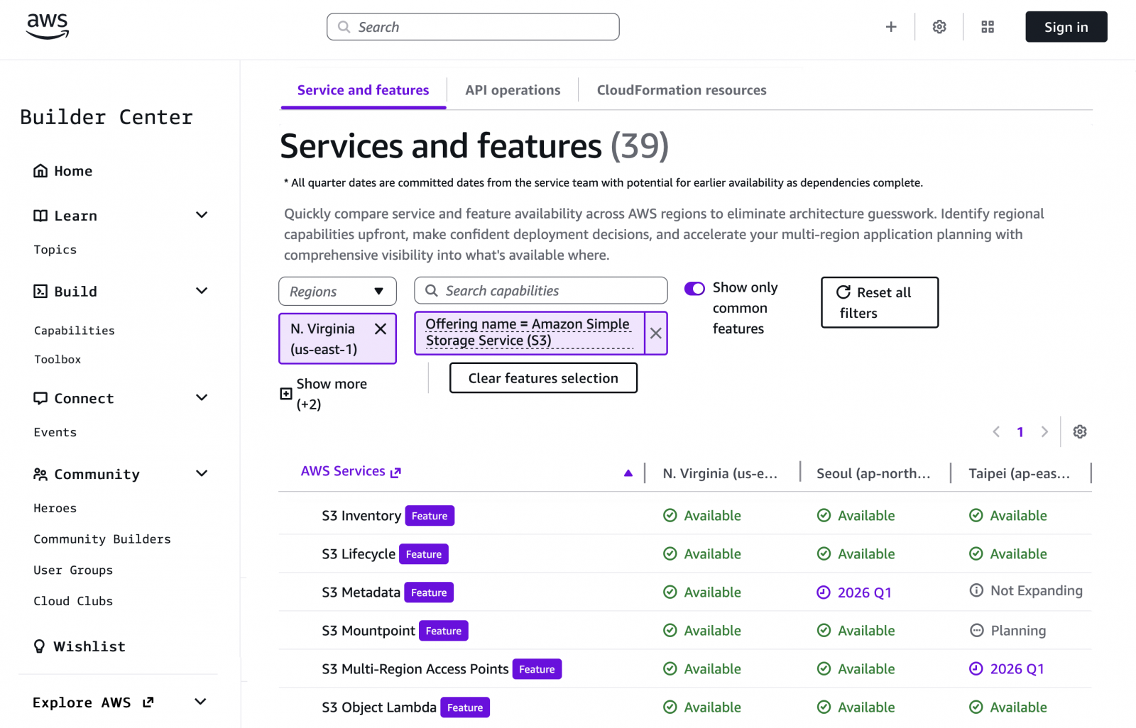 使用者可透過AWS Builder Center進入該工具,從下拉選單中挑選多個區域進行並排比較,也能直接搜尋特定服務或功能。介面提供只顯示共同功能的篩選選項,方便找出在所有選定區域皆可使用的功能,降低後續因區域差異導致的變更成本。官方示範以美東北維吉尼亞、亞太首爾與亞太臺北雲端區域比對Amazon S3功能,展示跨區查詢的應用場景。