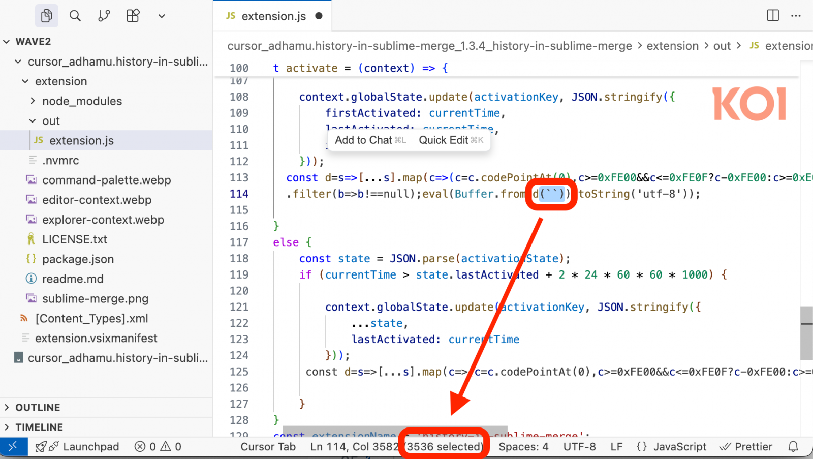 Koi Security於11月6日偵測到新一波GlassWorm活動,這次有三個套件出現明確的GlassWorm特徵,它們是:ai-driven-dev.ai-driven-dev、adhamu.history-in-sublime-merge,以及yasuyuky.transient-emacs,分別被下載3,300、4,000,以及2,400次,換言之,總共可能發生約9,700次的惡意軟體感染行為。這些套件都包含人眼看不見的Unicode字元,但都能透過JavaScript解譯器執行。