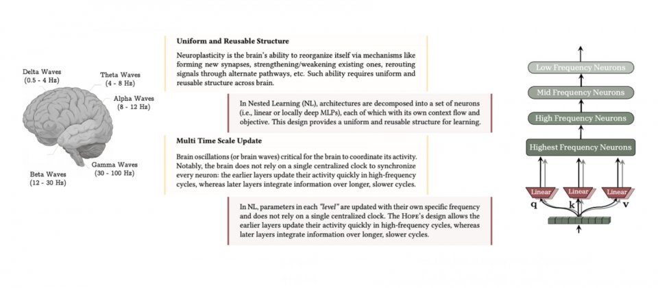 巢狀學習(Nested Learning)模仿人腦以多時間尺度協同運作的機制,讓模型各元件依不同更新頻率學習與整合資訊,使神經網路在持續學習中兼具快速反應與穩定記憶