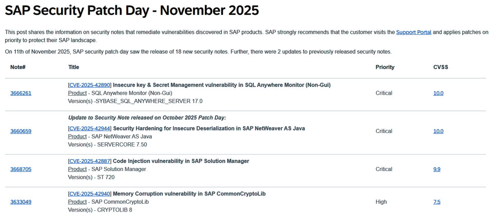 11月11日SAP發布本月例行更新(Security Patch Day),發布18份資安公告,更新兩份已發布的公告內容,最受到矚目的部分,是兩項CVSS評分接近滿分的資安漏洞,分別是:CVE-2025-42890與CVE-2025-42887。