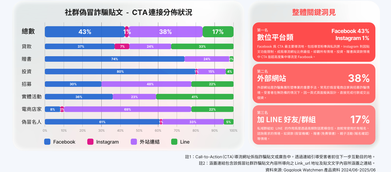 另一項重要調查結果,是解析了3種詐騙傳播鏈。簡單來說,這些假冒企業組織個人名義的貼文,普遍會引導受害者前往下一互動目的地,報告中歸納出3種導流網址類別:(一)導向數位平臺:粉絲專頁、私訊或IG貼文;(二)導向外部連結:假冒企業網站或購物下單頁面;(三)導向邀請加入私域群組或好友帳號:以LINE即時通訊為主。