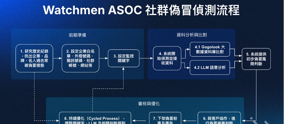 簡單來說,在偵測、分析階段,ASOC要能主動搜尋網路上潛在的冒名活動,像是主動蒐集並建立「冒名樣態資料庫」,同時運用文字與影像分析技術,辨識詐騙常用話術、誘導關鍵字、誇大語意及假帳號行為模式。而且,ASOC也要結合多方情資來源,運用AI與機器學習技術判斷偽冒品牌的元素,分析詐騙事件之間的關聯性與風險程度。