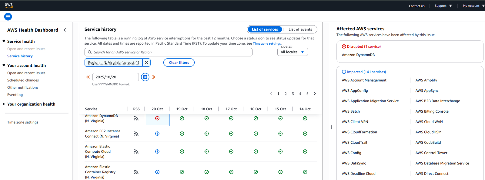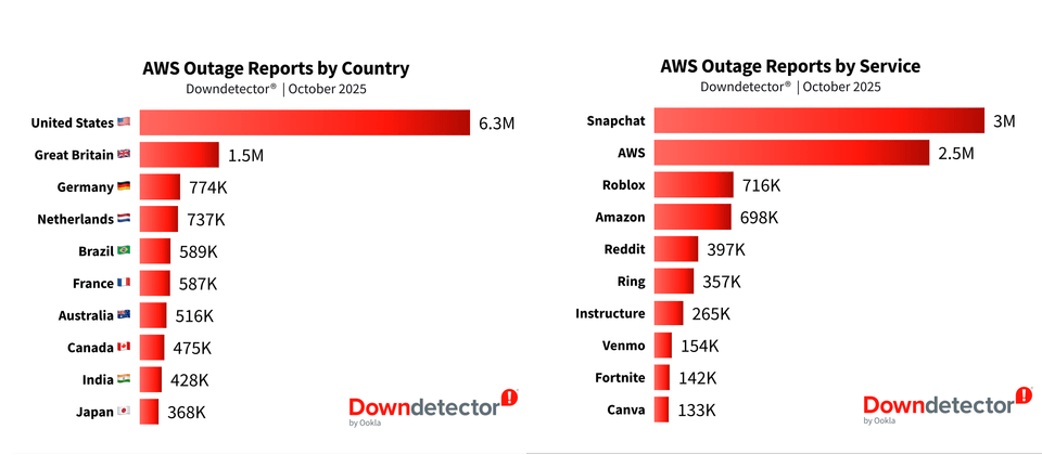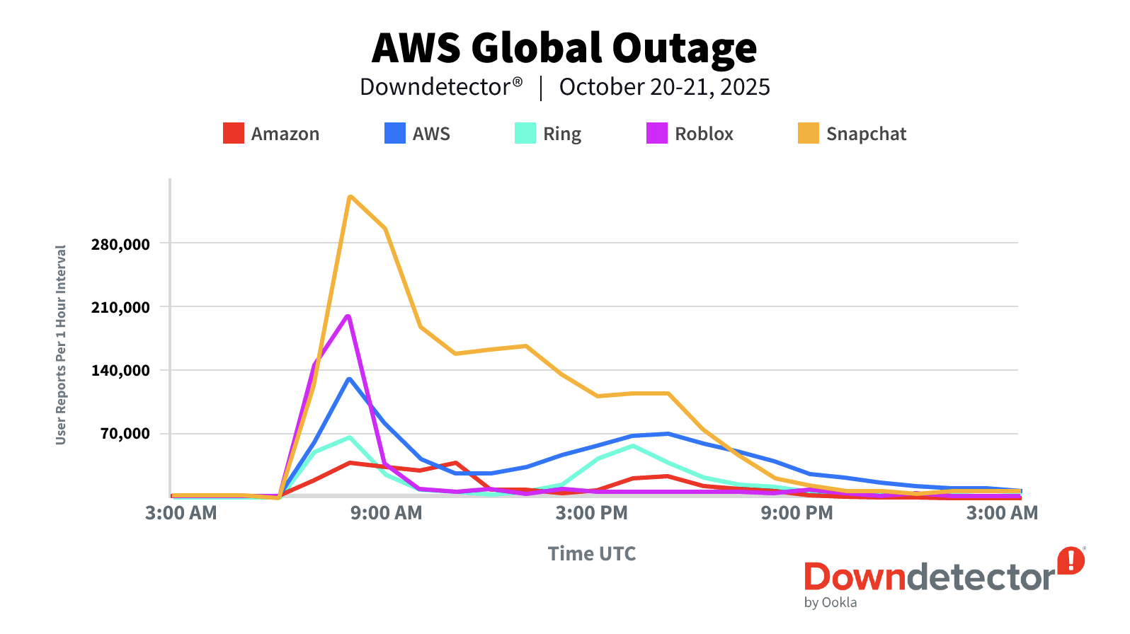 受到AWS大當機的影響,Downdetector的紀錄顯示,這些服務停擺的高峰與低谷受到時區差異的影響,歐洲當機通報的數量率先暴增,因為那時已是當地10月20日上午,許多辦公場所已開始運作,第二波高峰出現在北美10月20日上午。