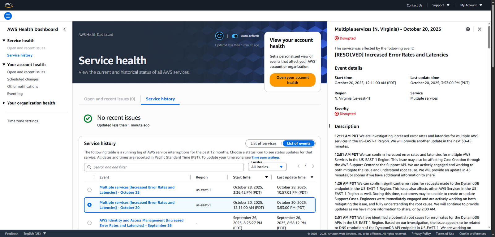 到了10月20日之後,依賴AWS的各項服務以不同速度復原,過程中,相關系統不斷透過重新嘗試、排隊依序執行,以及快取清空等程序。後續隨著更多使用者上線,Downdetector一度偵測到美國的當機通報數量超過600萬個。
