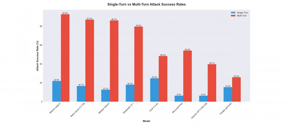 Cisco AI Defense研究人員指出,多輪提示攻擊(Multi-Turn Attack)正成為開源權重模型的主要弱點。在這份針對8款開源權重大型語言模型的黑箱(Black Box)測試中,研究團隊發現模型在多輪對話中更容易被誘導產生違規輸出,攻擊成功率最高達92.78%,最低也有25.86%,整體約為單輪攻擊的2到10倍。