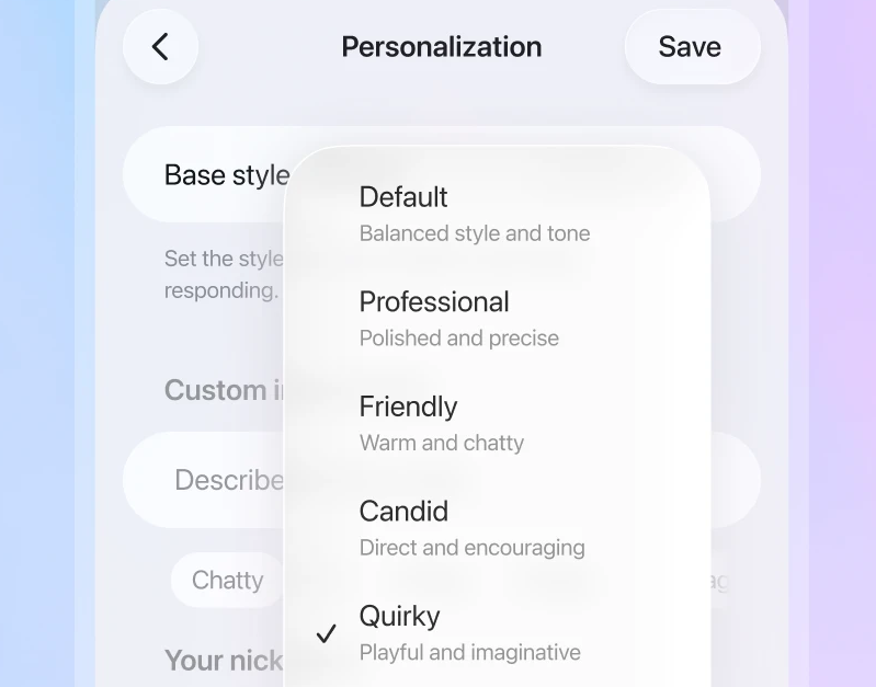 使用者除了可在設定中快速切換語氣風格,還能細部調整回覆的篇幅長短、溫度高低、可掃讀性及表情符號使用頻率。系統亦能在對話中偵測使用者的語氣需求,主動建議更新設定。