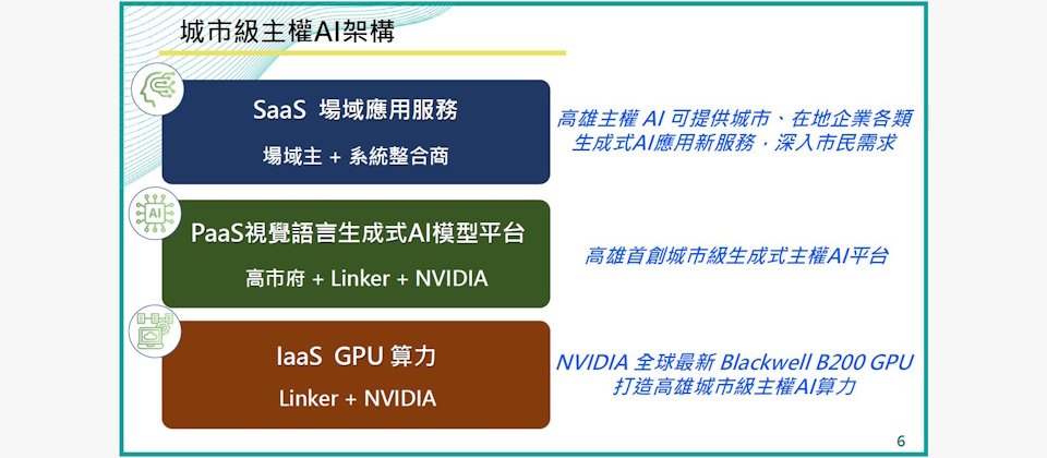 在IaaS層方面,鑑於GPU價格高昂,市府和Linker Vision、Nvidia合作,採用類似聯合開發的合作方式,由合作廠商提供運算資源作為IaaS層,採用Nvidia Blackwell B200 GPU。