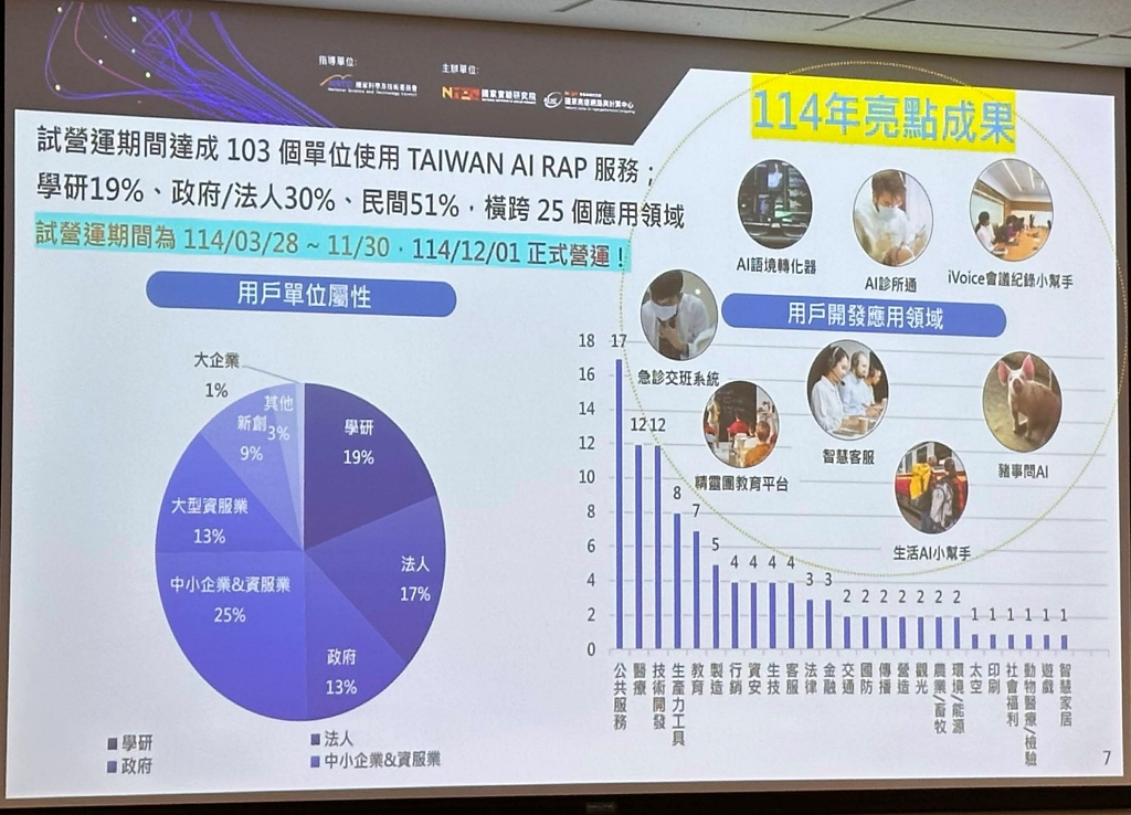 這次試營運期間共有103個單位採用AI RAP、所開發的AI應用橫跨了25個應用領域,以公共服務、醫療、技術開發為大宗。比如,國研院科政中心打造了iVoice個人化語音智能代理,能快速將語音轉錄為文字,並針對文字內容分析,也能對談互動;又或是農業科技研究院組長洪郁婷開發「豬事問AI」系統,農民透過簡單文字或語音輸入,就能查詢豬隻健康資訊與環境數據,且該系統還採用了包含中研院團隊開發的YOLOv7等物件偵測模型,可辨識豬隻狀態。而高雄榮總醫師林博翔開發ER-Pulse智慧交班平臺,可加速急診交班事項的撰寫,將原需數分鐘的人工作業縮短至數秒。國網中心預告,他們將持續維運平臺和發展模型外,今年12月還會啟用臺南科學園區的國網雲端算力中心,預計2029年公部門算力將到達480PFLOPS。(詳全文)