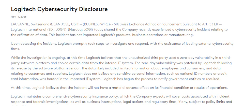 該公司初步調查研判,未授權第三方攻擊者利用「第三方軟體平臺」的零時差漏洞,從內部IT系統複製了部份資料。在甲骨文公告後,羅技已經修補了零時差漏洞。外洩的資料可能包含員工及消費者部份資訊、以及客戶、供應商資料。