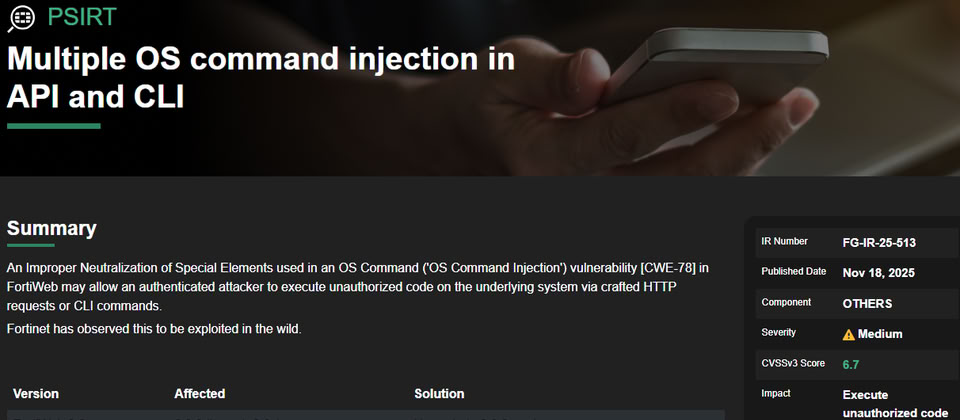 這個最新揭露的FortiWeb漏洞,被登記為CVE-2025-58034,是作業系統層級的命令注入漏洞,起因是特殊元件出現不當中和(neutralization)的現象,通過身分驗證的攻擊者可利用特製的HTTP請求,或是下達CLI命令,於作業系統底層執行未經授權的程式碼,CVSS風險評為6.7分(但該漏洞在美國國家漏洞資料庫登記為7.2分),Fortinet發布8.0.2版、7.6.6版、7.4.11版、7.2.12版,以及7.0.12版FortiWeb修補,美國網路安全暨基礎設施安全局(CISA)也在Fortinet發布公告的同一天,將這個漏洞列入已遭利用的漏洞列表(KEV),限期聯邦機構在一週內完成修補。