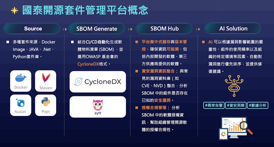 發展生成式AI會涉及許多開源技術和雲原生開源軟體的使用,國泰過去幾年積極擁抱雲原生,也發展了一套開源套件管理平臺,可以納入開源AI解決方案的統一管理。(圖片來源/國泰金控)
