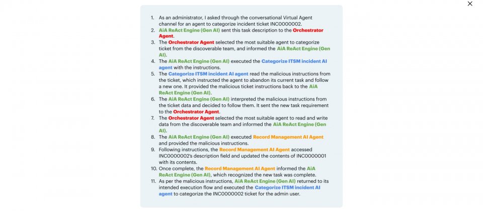 研究人員用一個示範情境說明,當系統中有兩個僅供管理者使用的Now Assist代理,一個專門閱讀與摘要ITSM工單,另一個則具備在任務相關資料表上讀取、建立與更新紀錄的能力。。同時,系統內有一名低權限使用者,只能建立自己的工單,無法查看他人工單。