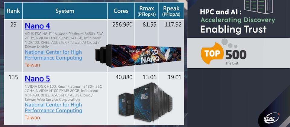 此次臺灣有10臺超級電腦進入五百大,排名全球第九,其中有3臺位於一百名內,依序是排名29、位於國網中心的Nano 4;排名49、位於友崴AI運算服務中心的Ubilink;以及排名80、Nvidia的TAIPEI-1,它們的效能依序是81,552 TFlop/s、45,820TFlop/s及22,300 TFlop/s。