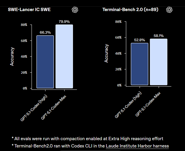效能方面,Codex-Max在基準測試全面超越舊版,比如SWE-Bench Verified基準測試達到77.9%、SWE-Lancer達79.9%。OpenAI表示,在保持品質下,Max 可減少約30%的Token用量,真實任務速度提升27%~42%。實測中,同一任務前代需3.8萬個Token,Max只要1.6萬;程式碼行數也從667行縮短到529行,速度則快了40%以上。