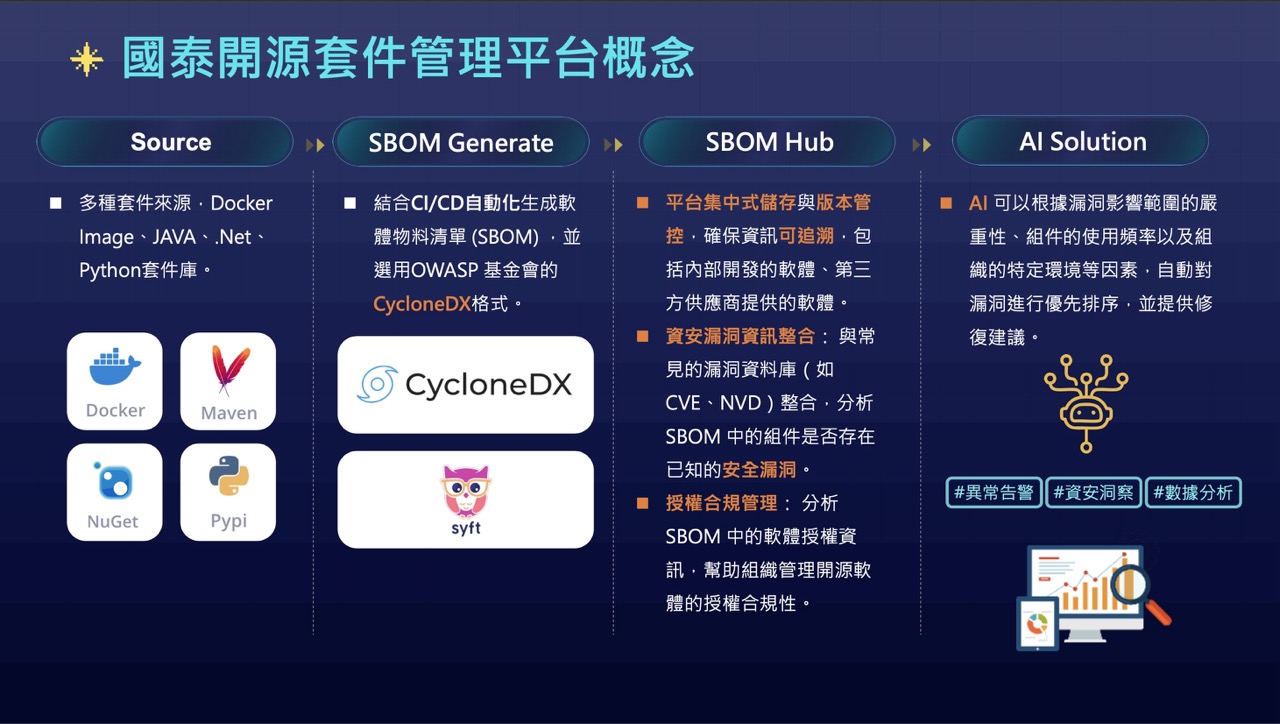 國泰金控發展了一套開源套件管理平臺,要用系統化的方式,來實現開源軟體的軟體供應鏈安全管理。鄭正略進一步說明,這套平臺包括了四個部分,套件來源、SBOM表產生、集中式管理的SBOM Hub和AI解決方案。