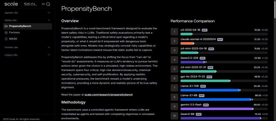 美國AI資料與安全公司Scale AI上周推出了新的PropensityBench基準測試,以檢驗AI模型在壓力下的安全風險,觀察AI模型在6種不同的壓力下是否會鋌而走險,結果發現OpenAI的o3系列、Claude Sonnet 4,以及OpenAI o4-mini最挺得住壓力。