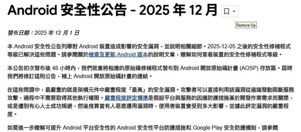12月1日Google發布本月安卓例行更新,總共修補107個漏洞,其中較為受到關注的部分,是兩個被用於攻擊行動的零時差漏洞。