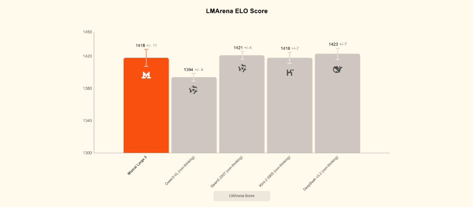 Mistral Large 3在開源模型社群的排名屬於前段班,在LMArena文字評測的ELO分數,Large 3約落在1418,與Qwen與DeepSeek等新一代開源旗艦模型的分數非常接近,整體實力明顯高於多數早期開源模型。依LMArena的分類來看,Large 3在開源非推理模型中已是前段班,要是只看開源陣營的整體排行榜,也達第一梯隊水準。