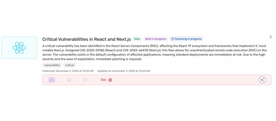 Wiz以自家掃描資料評估,約有39%的雲端環境出現受CVE-2025-55182或CVE-2025-66478影響的React或Next.js實例,顯示問題並非少數專案才會遇到,而是已經擴散到相當比例的實際部署之中。