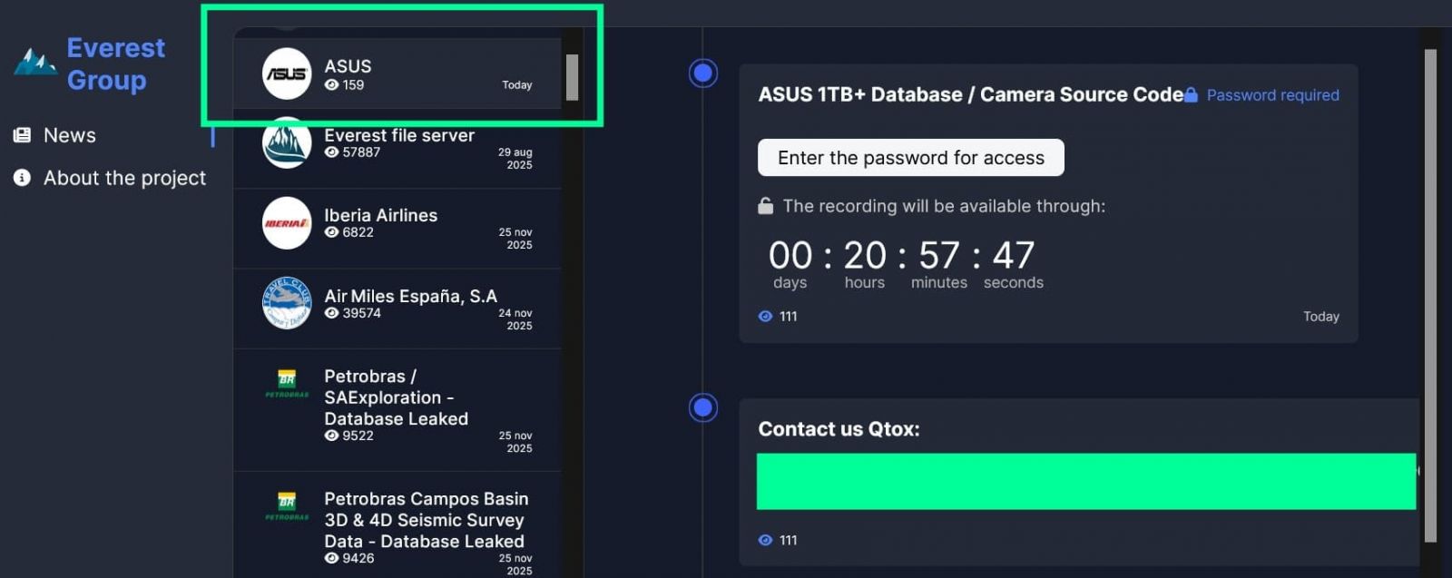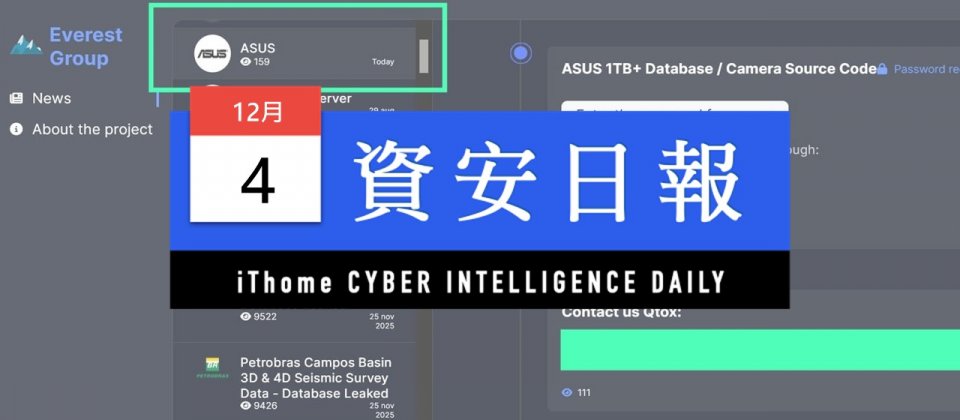 根據資安新聞網站HackRead、Cyber Daily報導,12月2日勒索軟體Everest聲稱,他們從華碩內部竊得超過1 TB的檔案,其中包含相機的原始碼,要求華碩限期在3日晚間11時前,透過加密通訊平臺Qtox進行聯繫。此事3日經民視財經網與多家國內媒體報導後,引起全臺注目。對此,華碩同日發出簡短聲明表示,他們的供應商遭到攻擊,受到影響的產品,包括:華碩手機的相機應用程式(與影像處理有關的原始碼)。該公司強調,華碩旗下產品、公司內部系統,以及用戶隱私,皆未受到影響,不過,這份聲明透露的資訊有限,仍有不少資訊沒有說明。