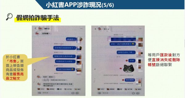 例如假網拍詐騙,以賣家的身分利用小紅書的「市集」上架販賣商品的資訊,當買家匯款後,賣家即消失並且斷絕聯繫管道;假投資詐騙則是假冒台股投資專家,透過詐騙貼文,誘使民眾加入Line投資群組進行投資詐騙;假交友投資詐騙則假借交友名義,誘使民眾後續加入Line群組進行投資詐騙。