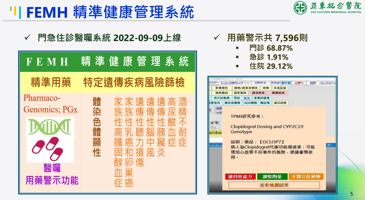 也因為有這些結果,他們在同年打造精準健康管理系統,正式上線於門診、急診和住院醫囑系統中,提醒醫師用藥風險和特定遺傳疾病風險,輔助醫師給予更精準的治療方案。