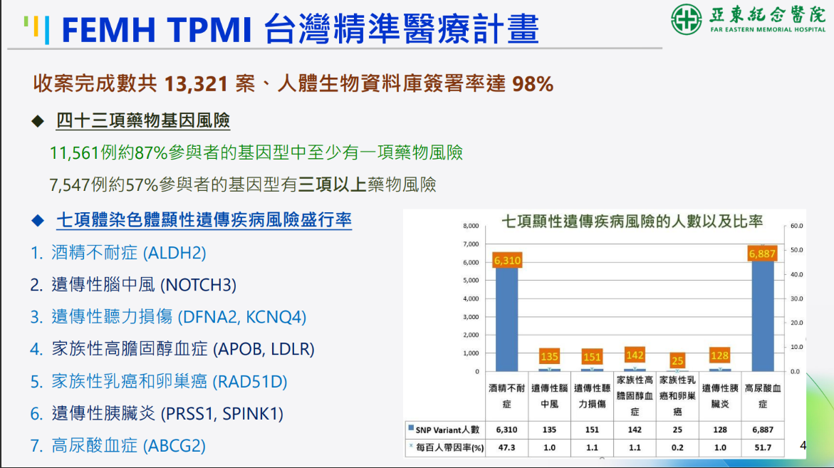 吳彥雯說明,醫院在2022年開始建置自家資料庫,也透過基因分析找出43項藥物基因風險、7項體染色體顯性遺傳疾病風險盛行率,如酒精不耐症、遺傳性腦中風、家族性高膽固醇血症和家族性乳癌和卵巢癌等。