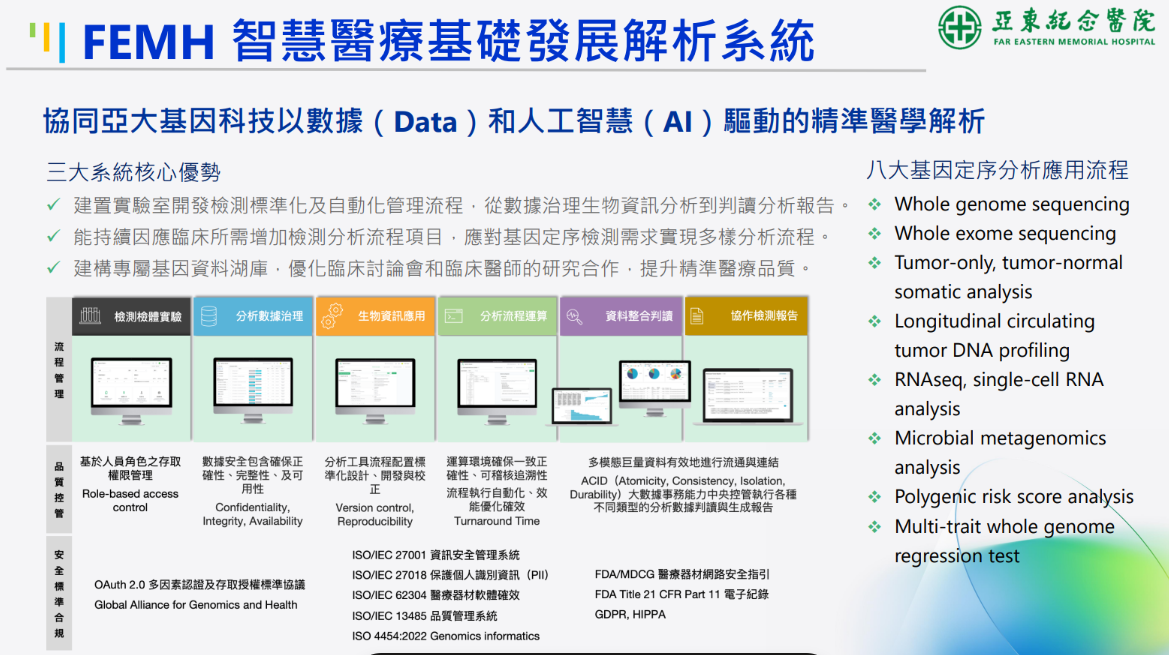 亞東紀念醫院12月5日揭露自家精準醫療永續平臺,這是一套2023年開始打造的第核心基因定序雲端系統,採用去年底落地臺灣區域的微軟Azure雲端服務,加速基因分析時間達16倍。該系統資料庫涵蓋1.3萬名個案、共90億筆資料,其龐大資料的查詢時間從原本的140秒縮短為12秒左右,大幅提高研究效率。亞東紀念醫院也將基因定序分析結果應用於臨床,在門、急、住醫囑系統中提醒醫師用藥風險和特定遺傳疾病風險,讓醫師更精準對症下藥。