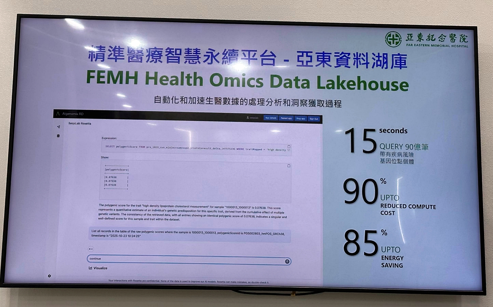 由於亞東紀念醫院基因資料龐大,擁有共90億筆變異資料的資料湖庫,查詢速度也變得關鍵。為支援即時互動式分析和快速臨床決策,新系統強化了SQL查詢效能,透過境內雲端高效能運算和查詢,平均查詢時間從140秒縮短至約12秒。以每月處理1,000筆查詢為例,可節省臨床醫師數10小時的等待時間,大大提高基因檢測和決策效率。