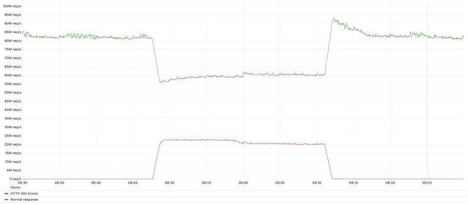 管理團隊利用漸進部署系統第一次變更WAF規則時,發現內部WAF測試工具不支援擴大緩衝,且對客戶流量沒有影響,因此他們做了第二次變更,想將WAF規則測試工具關閉。然而其全球配置系統未執行漸進式部署,而是在數秒內將變更一下子部署到Cloudflare網路的所有伺服器。在「特定情況下」,這次變更的程式執行來到FL1版本的代理伺服器時,觸發規則模組一個臭蟲而引發錯誤,導致500 HTTP錯誤碼。這是一個runtime錯誤,影響由較舊的FL1代理伺服器及Cloudflare代管的客戶網頁資產,只有少部份測試終端,以及中國網路支援的客戶例外。