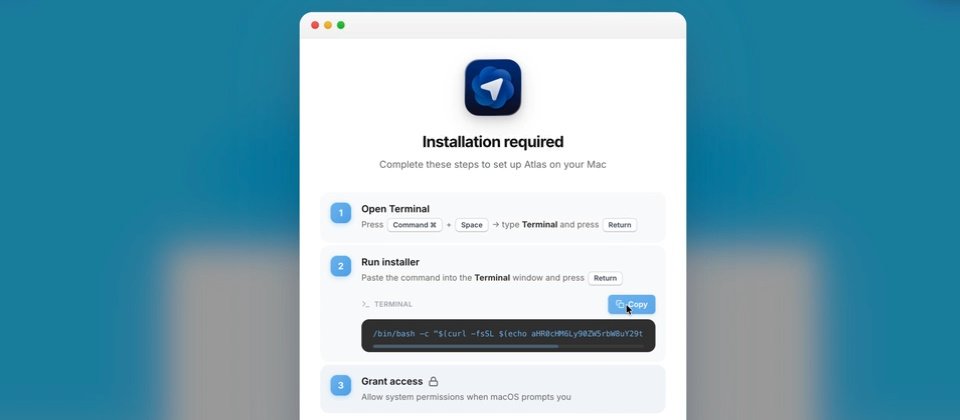 這個假網站藉由代管在Google Site,以提升其可信度,而且網站設計和正版Atlas網站在排版及設計上幾乎相同。但是假網站和正版操作指令有相當不同。有別於標準版installer(.dmg),冒牌網站提供一段看似無害的base64字串指令,要求使用者貼在Terminal執行。一旦執行後,該指令就解碼成代管於一個攻擊者控制網域的遠端腳本程式。