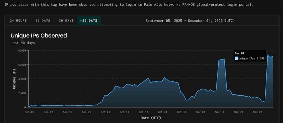 12月2日威脅情報業者GreyNoise發現新一波攻擊,攻擊者透過超過7千個IP位址,嘗試登入GlobalProtect,這些攻擊都來自一家德國公司3xK GmbH經營的基礎設施,而相關的攻擊並非首度出現,因為GreyNoise比對3個來源用戶端的身分特徵(fingerprint)後發現,這些用戶端曾在9月下旬至10月中旬,用於其他攻擊行動,當時GreyNoise發現,攻擊者使用的自治系統編號(ASN),過往未曾與惡意基礎設施出現關連。對此,我們也詢問Palo Alto Networks,不過在截稿之前並未收到回應。