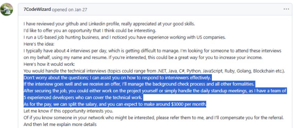 假若因此得到駭客想要的職缺,出面面試的開發人員或工程師不須自行處理工作內容,只要參加短暫每日會議(Daily Stand-ups),偶爾露臉接聽視訊通話,就有機會得到月薪35%的酬勞。至於真正的工作,會交由幽靈開發人員(Ghost Developers)處理。然而,上述應徵者只需負責露臉就能得賺錢的好康,實際上就是將自己的身分提供給駭客冒用,一旦東窗事發,他們就會成為受害公司後續追討損害賠償的目標。