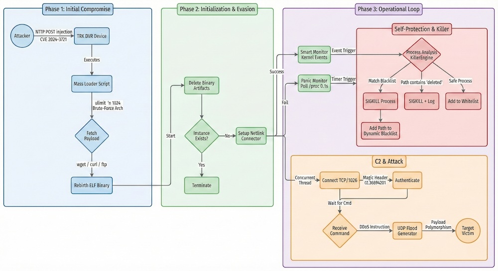 資安業者Cydome發現Mirai變種Broadside,駭客專門針對海運的物流產業而來,鎖定該產業廣泛運用的TBK DVR設備,利用已知漏洞CVE-2024-3721(CVSS風險評為6.3分)作為主要滲透的管道。由於這些業者往往會利用DVR監控船隻各個區域,若是這些裝置遭到入侵而影響運作,有可能讓船上的成員無法掌握船隻的安全。再者,殭屍網路會占用衛星通訊網路的頻寬發動DDoS攻擊,使得船隻的網路通訊上行線路完全被占據而影響通訊能力。另一方面,有許多舊型船隻的DVR能存取關鍵的操作科技(OT)網路,使得攻擊者能將這種設備作為橫向移動的據點。