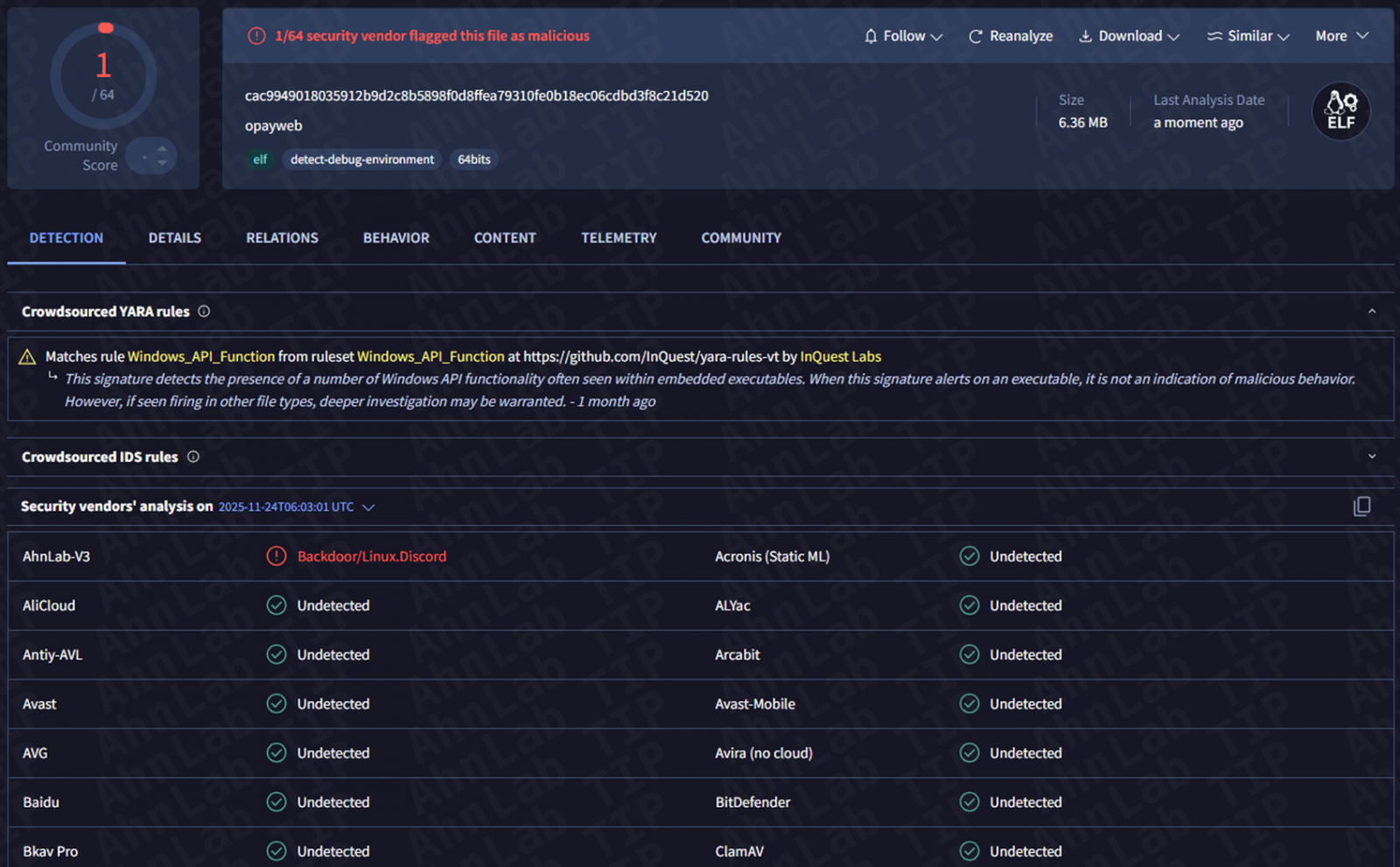 其中一種後門程式,是以Discord機器人為基礎打造而成,且難以察覺,AhnLab指出該後門行蹤相當隱密,因為他們在攻擊者活動過程期間,發現磁碟有存取的痕跡,並搭配網路活動的事件記錄,才察覺該後門程式的存在。截至11月24日,VirusTotal的防毒引擎僅有1個將其視為有害。