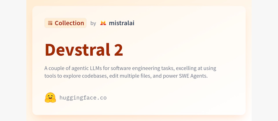 法國AI新創公司Mistral本周公佈開源程式撰寫模型Devstral 2、輕量版Devstral Small 2,以及CLI代理人等相關工具加入軟工代理人戰局,並提供一段時間的免費API存取。