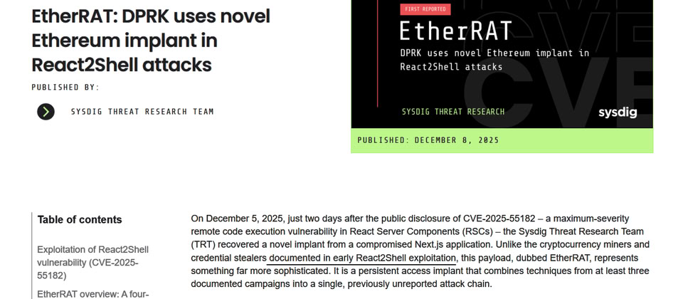 資安業者Sysdig指出,他們發現有人利用React2Shell散布名為EtherRAT的惡意軟體,過程中使用的作案工具,與北韓駭客先前的活動Contagious Interview有所交集。針對這波活動,可能代表北韓已有國家級駭客開始利用React2Shell,而且各駭客組織之間存在複雜的作案工具共用關係。