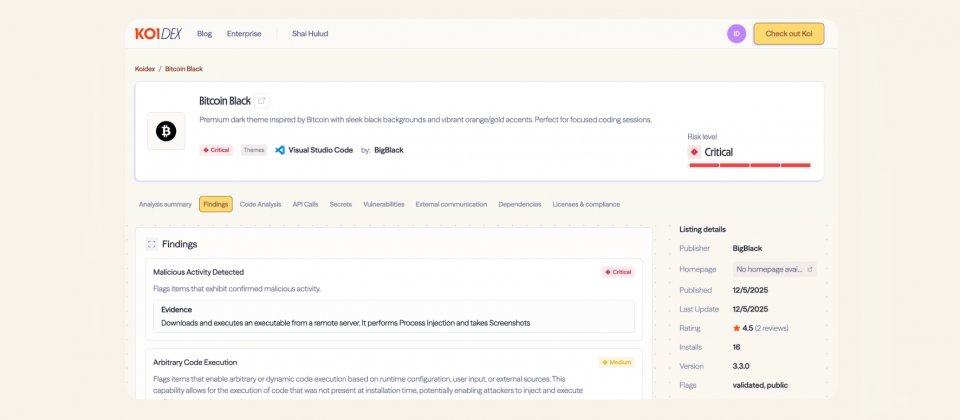 資安廠商Koi Security揭露兩款上架於微軟VS Code市集的擴充套件,被證實會在開發者電腦安裝資訊竊取惡意程式,這兩款分別名為Bitcoin Black與Codo AI的擴充套件,分別偽裝成暗色主題與AI程式開發助理,在背景下載並啟動螢幕截圖與憑證竊取程式,能擷取桌面畫面、讀取儲存的WiFi密碼與瀏覽器工作階段。