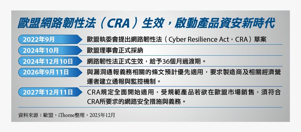 例如,歐盟網路韌性法(CRA)已於2024年12月正式生效,並設有兩大關鍵時程:第一,自2026年9月11日開始,要求製造商建立漏洞揭露與處理機制等規定上路;第二,自2027年12月11日起,CRA 的主要義務將全面適用,所有要在歐盟市場銷售、且含有數位元件的產品,都必須符合該法的基本資安要求與合規評估;違規者最高可處 1,500 萬歐元或前一年度全球年營收2.5%的罰款,甚至被禁止在歐盟市場銷售。