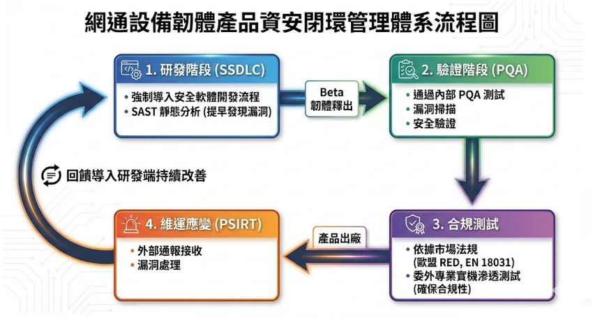 合勤投控資安長游政卿指出,產品安全需要從首行程式碼到產品退役的全生命週期管理,形成一個可持續精進的產品資安完整閉環(如圖)。他強調,合勤的目標是建立一套能快速應對突發事件、日常無聲防禦的流程,將資安韌性深植於健全的機制中,而非依賴個人。圖片來源/合勤