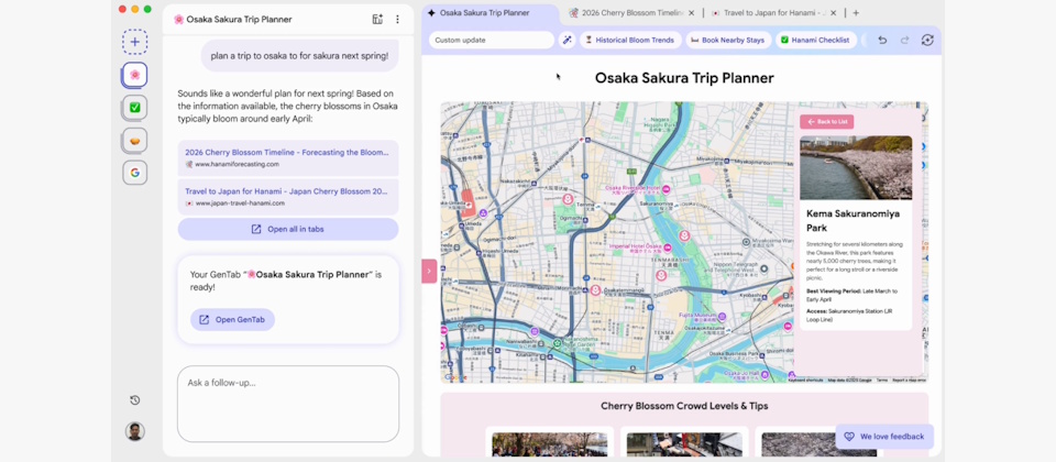 GenTabs能將使用者開啟的多個網頁分頁,轉化成一個互動式App。使用者在瀏覽器左側邊欄的AI聊天機器人輸入提示,例如想去某個地方旅遊、以及想看什麼景點等,並逐次點選搜尋結果中的特定網頁。GenTabs底層的Gemini會分析使用者的對話紀錄及開啟的分頁,並尋求使用者增修意見,最後建立互動式網頁應用程式,例如一個包含旅遊景點的地圖、天氣、日期的Web App。使用者不需撰寫任何一行程式碼,只要以自然語言描述需要什麼工具。所有生成的元素都會連結回原始來源。
