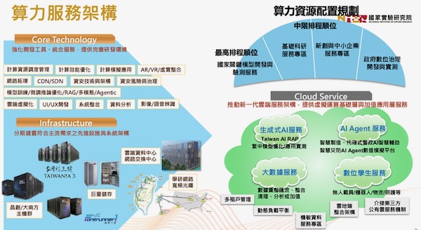 這座雲端算力中心,以及預計在2029年建置完成具有120MW電量的沙崙智慧創新算力中心,將作為我國中長期大型算力的基地,國研院預期未來兩座中心建置完成,可望將算力擴充至23MW。