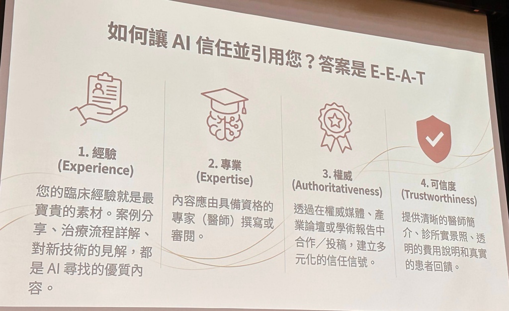 「專業」則是由具備醫師資格的專家親自撰寫或審閱內容;「權威」來自在專業媒體、產業論壇或學術場域發聲,累積可被引用的信任度;而「可信度」則體現在清楚的醫師介紹、診所實景照片、透明的費用說明,以及真實病患回饋。